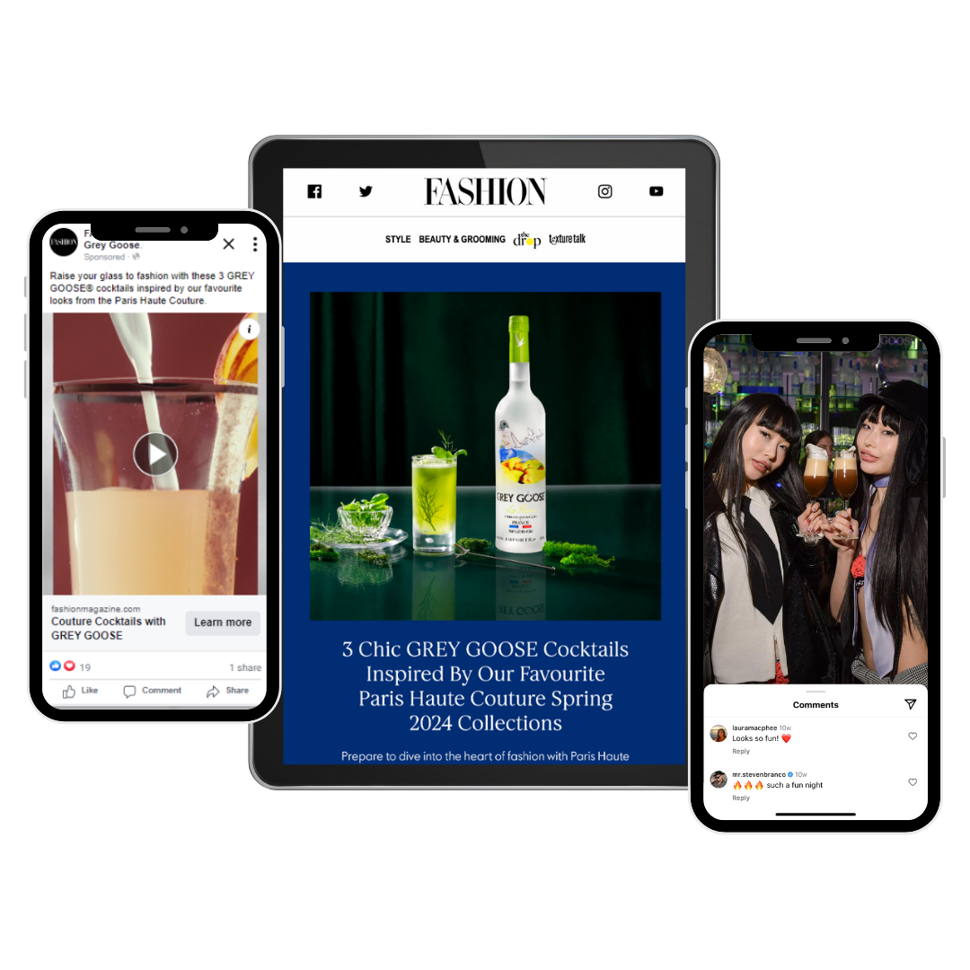 To align Grey Goose with high fashion, this campaign showcased bespoke cocktails inspired by Paris couture runway looks and curated by FASHION's creative director. The story unfolded across a custom digital hub, video, branded content, and an event executed by Wonder, SJC Media's events division.